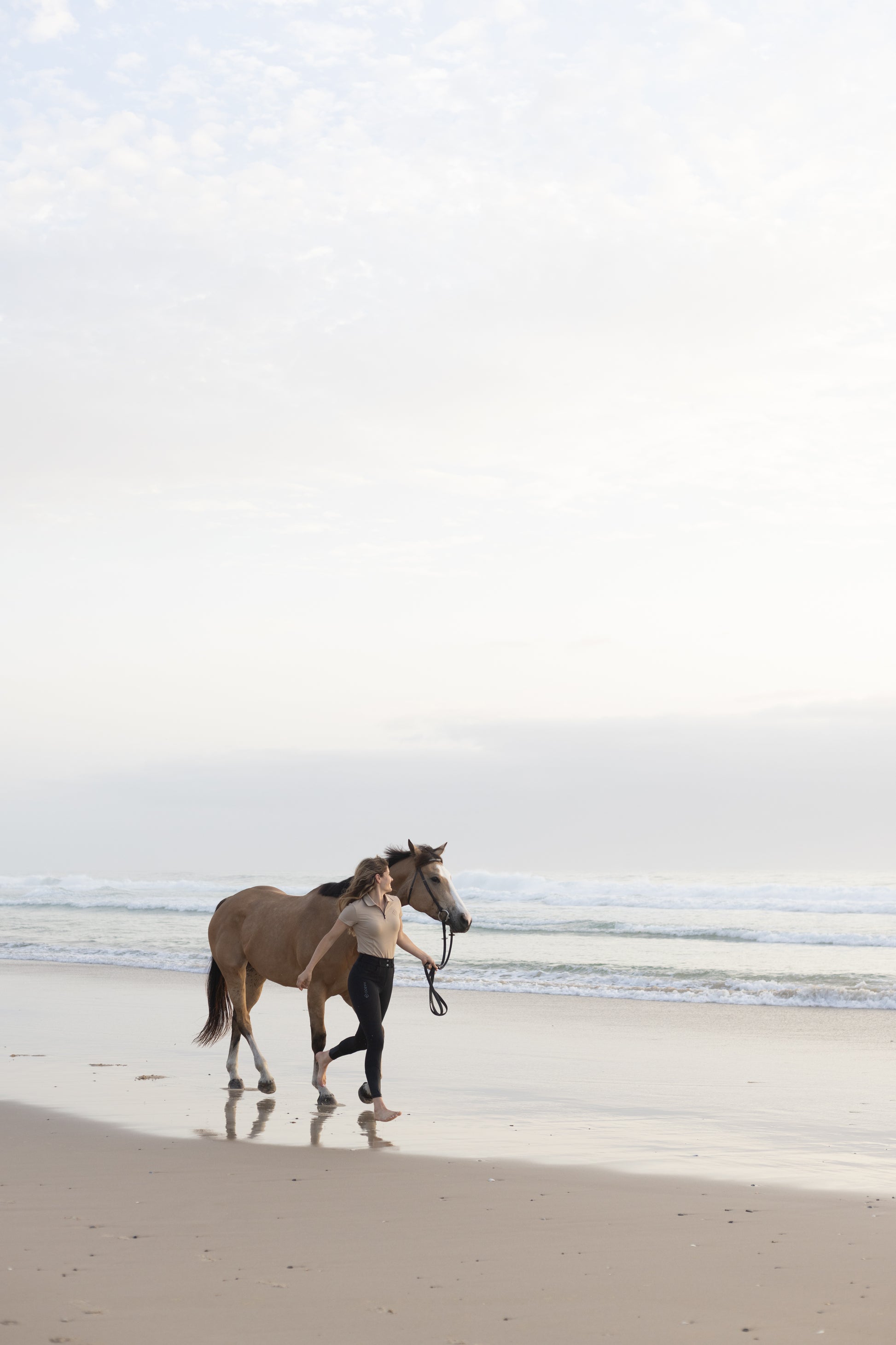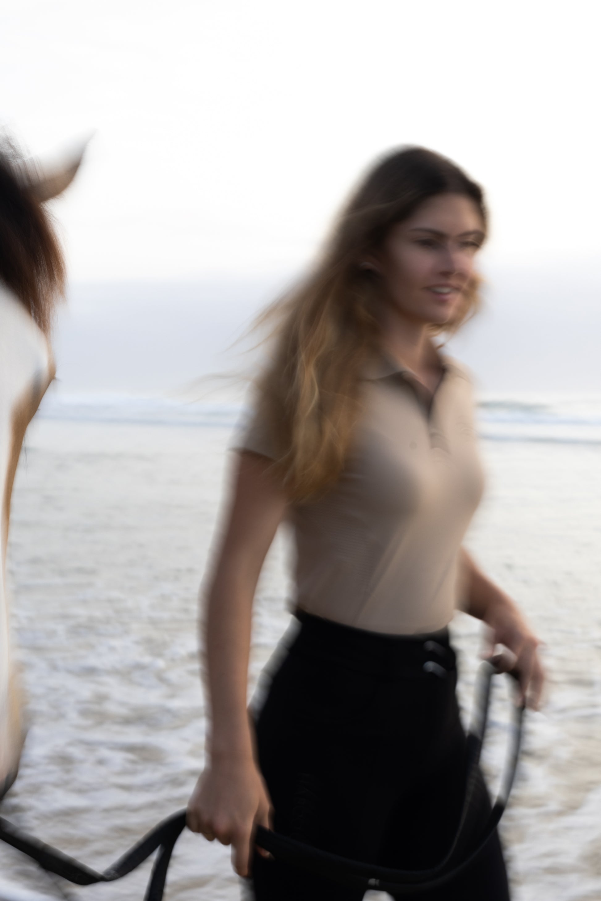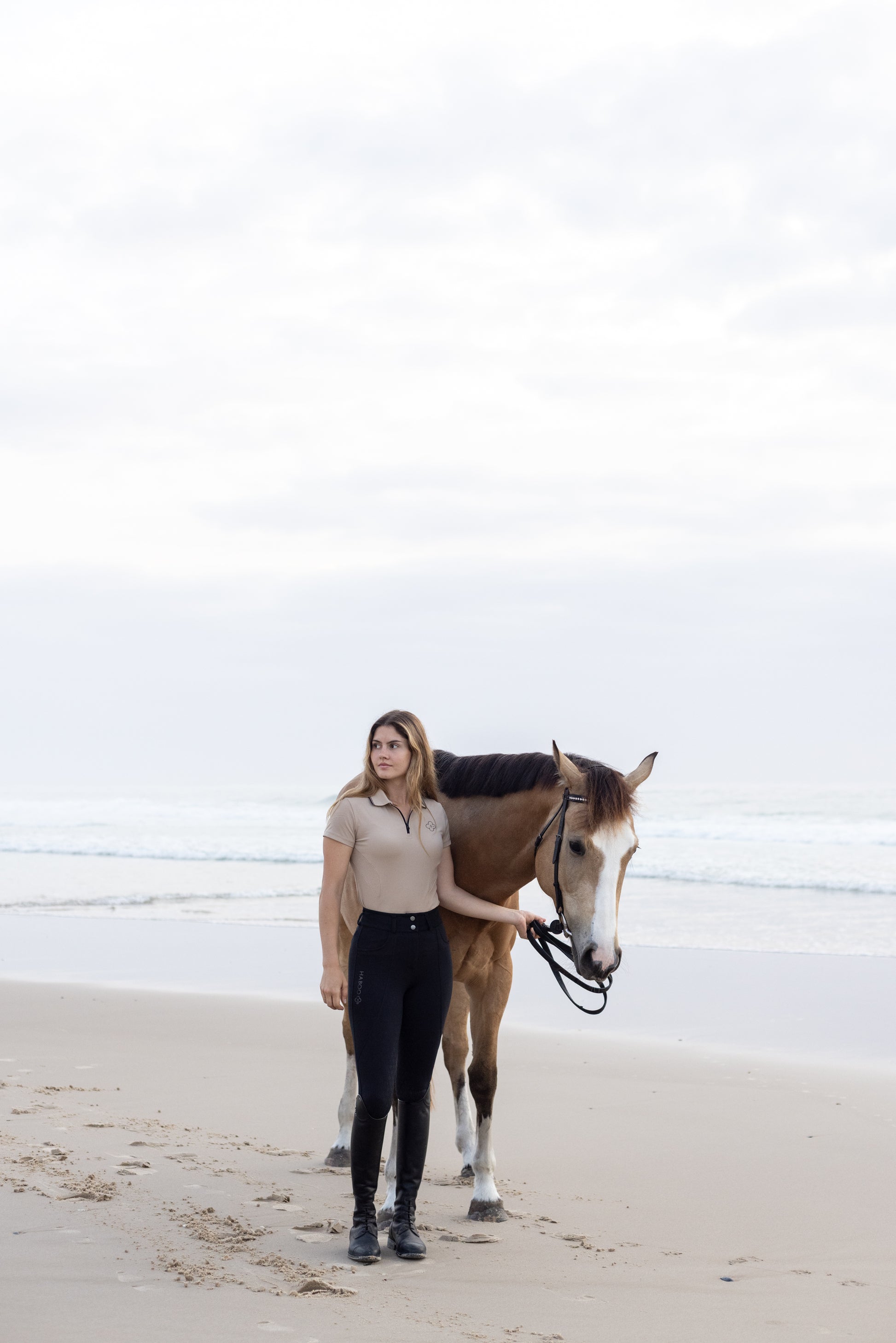 Experience the perfect blend of style, comfort, and performance with our Beige Classic Riding Polo. Designed for rider, by riders, this polo now features contoured shaping seams around the stomach for a flattering, sculpted fit, alongside breathable mesh side panels that enhance airflow to keep you cool. The tailored fit still allows for ease of movement with the four-way stretch material, making it ideal for both training sessions and casual outings. Ride in confidence and style with this essential piece for any equestrian wardrobe.